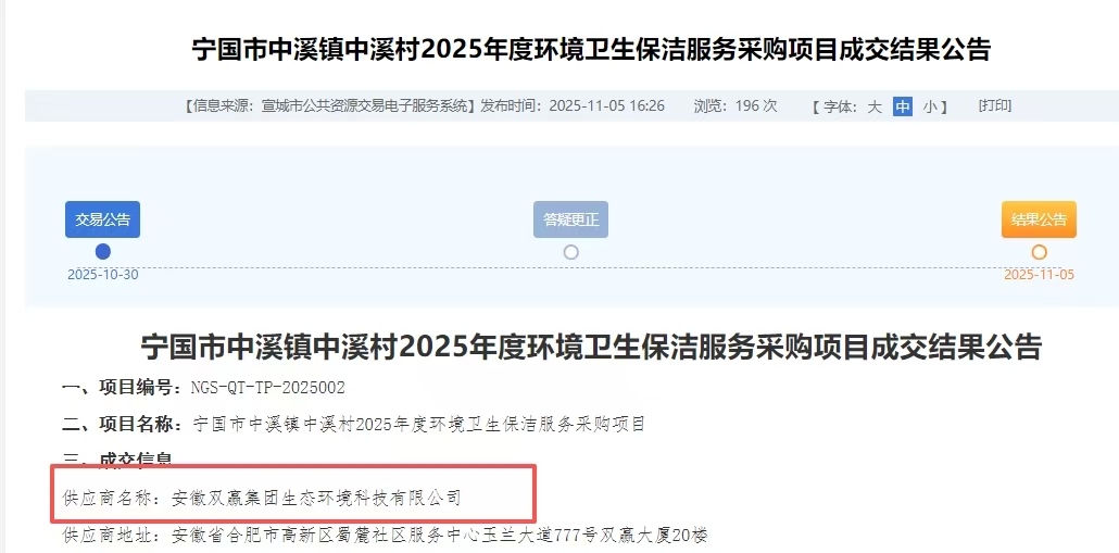 2025-11-06 安徽雙贏集團生態(tài)環(huán)境科技有限公司中標寧國市中溪環(huán)衛(wèi)項目